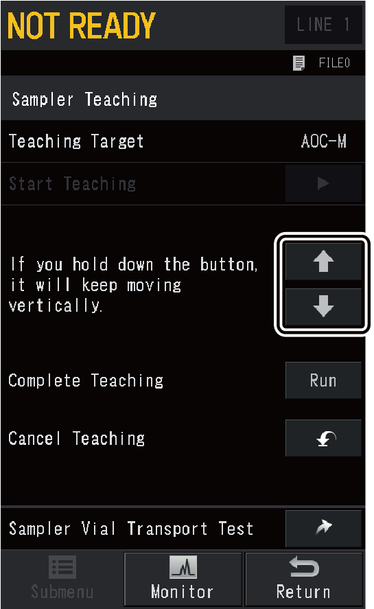 Press HOME button - [AOC] - [Sampler Vial Transport Test], and then [Move].