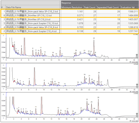 在筛选阶段采用全因子设计总共筛选2种流动相和3种色谱柱,对结果进行评估来确定哪种分析条件所获得的色谱图是最优的。LabSolutions MD软件可以自动计算出评估值,从而快速轻松地找到最佳色谱分析条件。