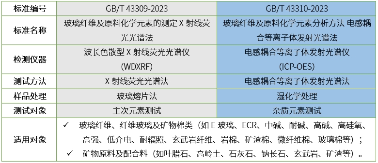 两项标准规定了使用X射线荧光光谱法和电感耦合等离子体发射光谱法测定玻璃纤维及原料中化学元素的分析方法,以及适用对象。