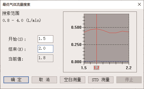 在使用有机溶剂和调节燃烧器高度之后,需要求出火焰气体流量的最佳值。AA-7800可自动进行气体流量的优化。在测定由气体流量引起的空白样品与标准样品吸光度的变化后,画面显示两者之差的同时,检测出灵敏度最高的气体流量,并将该值自动设定为流量。