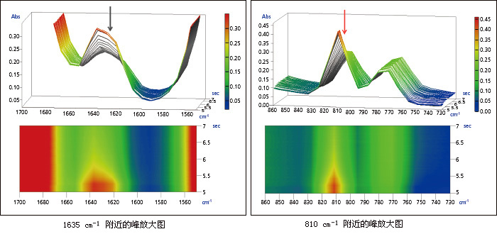 表示1635 cm-1 以及 810 cm-1 的峰面积时间扫描图。紫外线照射后的数秒内,这些峰急剧地减少了。